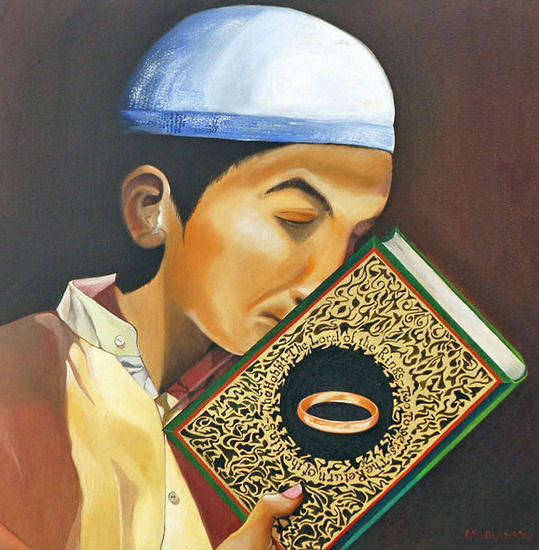 In de ban van ..... werd gemaakt naar aanleiding van een kleurenfoto in het Noord Hollands Dagblad. De uitstraling van deze devoot ogende moslim, nodigde uit om geschilderd te worden. In die periode raakte ik compleet in de ban van The Follow Ship of the Ring. Hierdoor werd de Islamitische Bijbel de Koran vervangen door het meesterwerk van J.R. Tolkien, In de ban van de Ring.